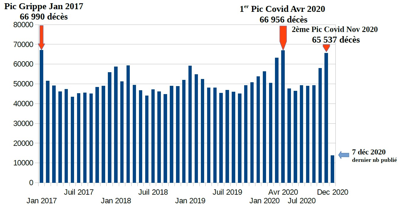Pour relativiser l'importance des 2 épisodes épidémiques 2020 en France, il faut se souvenir qu'au mois de Janvier 2017, pic épidémique de la grippe saisonnière de cette année là, le nombre de décès en France, toutes causes confondues, a été, selon l'INSEE, de 66 990. Ce nombre de décès était supérieur à celui d'avril 2020, pic épidémique de la crise Covid-19: 66 956 décès. Nos médias et nos hommes politiques n'en avaient pas fait tout un fromage, nos structures hospitalières avaient tenu, et la France n'avait pas eu recours au confinement général du pays, solution moyenâgeuse, pour limiter la contagion et la létalité d'un virus grippal 2017 particulièrement meurtrier.