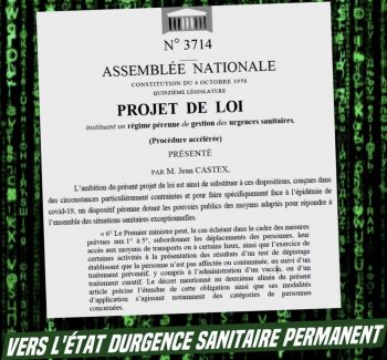 L'état d'urgence sanitaire permanent. Censé être une mesure « exceptionnelle » et « temporaire » de restriction des libertés, « l'état d'urgence sanitaire » va entrer en grande partie dans le droit commun. Comme l'état d'urgence après les attentats de 2015, au nom de l'exception, les gouvernants imposent en fait, progressivement, un Régime autoritaire. La loi prévoit de créer un « état de crise sanitaire », qui donne donc plus de pouvoir au gouvernement, supprime le vote du parlement sur les mesures sanitaires, et surtout, est illimité dans le temps. Le gouvernement pourra par exemple imposer des mises en quarantaine, réquisitionner des personnes et des biens... Mais « l'état d'urgence sanitaire » que nous connaissons, qui impose les mesures de confinement et suspend les règles démocratiques, ne disparaît pas pour autant, il restera l'étape maximale. Il est enclenché par décret et ne doit être voté qu'au bout d'un mois par le parlement. Nous allons donc doit vers un « état de crise sanitaire » permanent qui peut être rehaussé en « état d'urgence sanitaire » selon les situations.