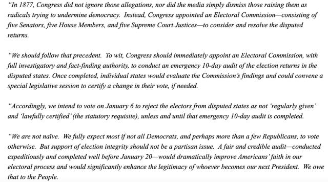 Les sénateurs et les sénateurs élus demandent au Congrès de nommer une commission chargée de procéder à un audit d'urgence de 10 jours des résultats des élections dans les États où les résultats sont contestés. Ils citent comme précédent la course de 1877 entre Samuel Tilden et Rutherford Hayes dans laquelle il y avait des allégations de fraude dans plusieurs États.