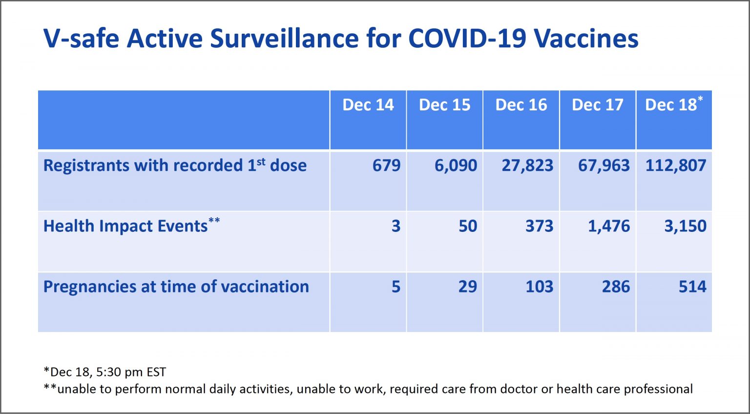 Le 18 décembre, 112 807 personnes ont reçu une injection du vaccin Pfizer/BioNTech aux États-Unis. Parmi elles, 3 150 ont été par la suite incapables d'effectuer leurs activités quotidiennes normales, incapables de travailler, nécessitant les soins d'un médecin ou d'un professionnel de santé. Il s'agit d'un taux d'événements indésirables de 2,8%.