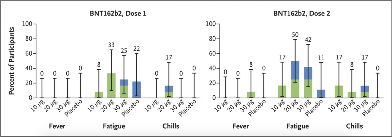 Sur les 39 personnes âgées qui ont reçu deux doses de BNT, la moitié environ ont ressenti de la « fatigue », 15% environ ont eu des « frissons » et trois d'entre elles ont eu de la fièvre. Les effets secondaires les plus fréquents du BNT sont les nausées, les maux de tête (un trouble du système nerveux induit par le BNT très fréquent), l'arthralgie et la myalgie (très fréquentes), la fatigue, les frissons et la fièvre (là encore très fréquents.) À part la fatigue, personne dans le groupe placebo n'a souffert de ces problèmes.