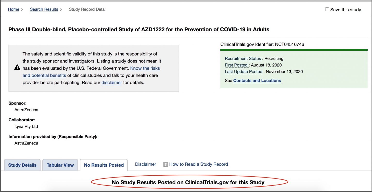 Ainsi, le public a l'impression que les essais sont terminés et que les régulateurs ont des normes de sécurité strictes. L'essai de phase 1,2,3 pour l'AZD1222 a été enregistré auprès du Centre américain de Contrôle des Maladies sous le nom d' essai clinique NCT04516746 [Archivé le 29 décembre 2020]. Il est incomplet et la date de fin estimée est le 21 février 2023. Le CDC déclare :