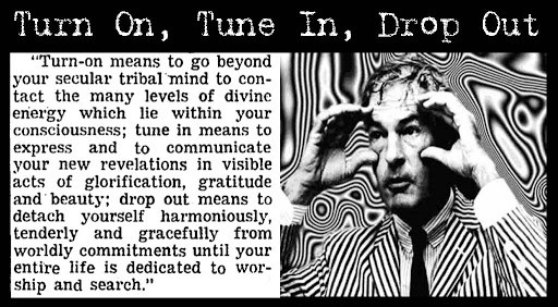* "Turn on, tune in, drop out" : le slogan lancé par le « pape du LSD » californien Timothy Leary en 1969 peut se traduire par « Branche-toi (sur l'acide), mets-toi au diapason (de tes vibrations intérieures) et décroche (du système, de l'American way of life » ; Ce n'est pas tout à fait la ligne des Davossiens, qui, loin de vouloir décrocher du système, souhaitent désespérément le sauver. Ils ont donc remplacé "drop out" par "get involved" (engagez-vous,r engagez-vous)