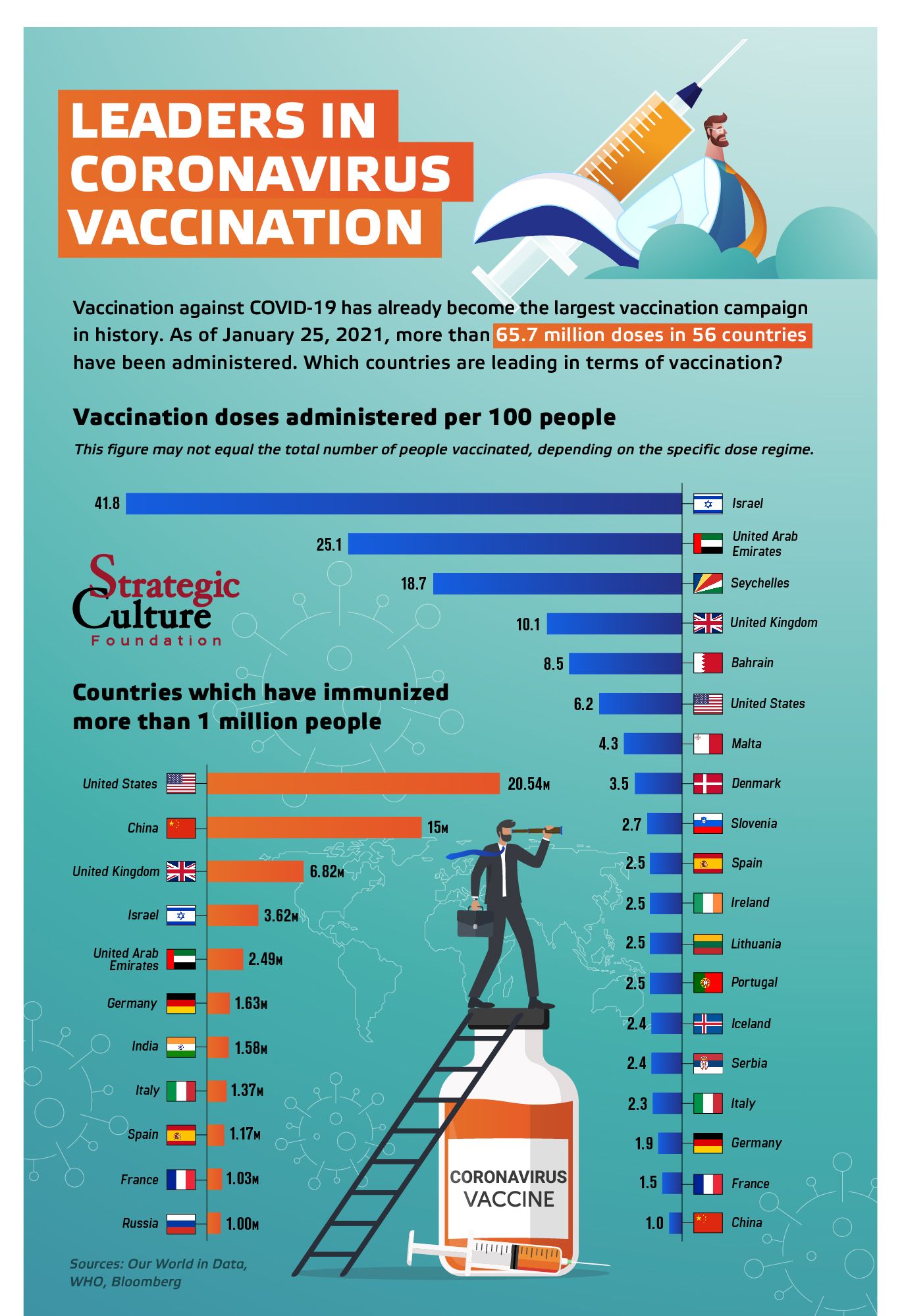Vaccination against COVID-19 has already become the largest vaccination campaign in history. As of January 25, 2021, more than 65.7 million doses in 56 countries have been administered. Which countries are leading in terms of vaccination?