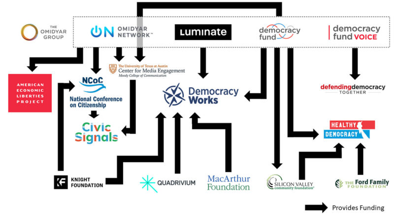 Ces milliardaires sont capables d'influencer les gens bien mieux que l'État. Prenons l'exemple de Pierre Omidyar. En plus d'être le propriétaire d'eBay, il est la force derrière des centaines d'ONG. Ses organisations bricolent l'agenda « progressiste » et forment les fantassins du Green Deal, la mouvance écolo officielle. Roslyn Fuller, de Spiked-online, a vérifié la pléthore d'ONG qu'il emploie, et voici le diagramme: