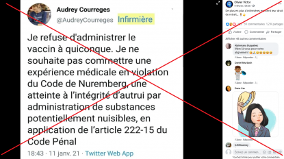 Posté le 11 janvier sur Twitter quelques jours après le début de la campagne de vaccination en France, le message d'Audrey Courrèges est sans appel: "Je refuse d'administrer le vaccin à quiconque. Je ne souhaite pas commettre une expérience médicale en violation du Code de Nuremberg, une atteinte à l'intégrité d'autrui par administration de substances potentiellement nuisibles, en application de l'article 222-15 du Code Pénal", lance celle qui se présente comme infirmière sur son compte où elle met notamment en doute l'ampleur de la pandémie en France et critique les restrictions sanitaires.