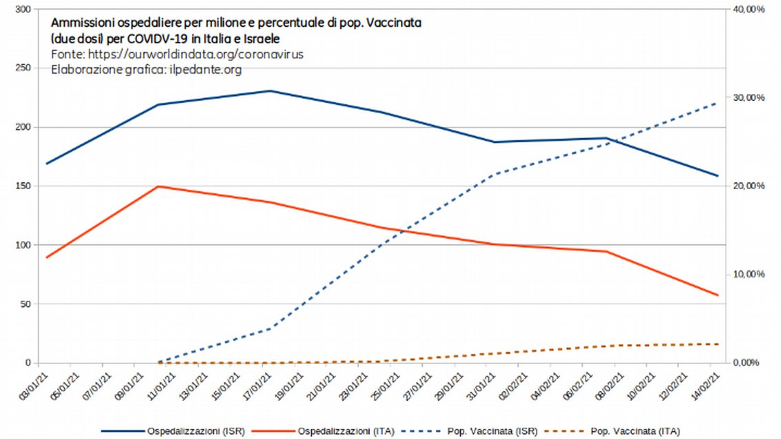 Ce graphique, élaboré par « Il Pedante » sur des données de ourworldindata.org, nous montre que l'évolution des admissions (hospitalisations), du début de l'année jusqu'à la mi-février, est parfaitement homogène en Israël (courbe bleue) et Italie (courbe orange). Et ce, malgré l'énorme différence dans les vaccinations entre l'Etat sioniste (courbe en pointillés bleus) et notre pays (courbe en pointillés oranges). Enfin, et ce n'est pas anodin, on peut noter que le nombre des hospitalisations (par million d'habitants) est resté constamment plus élevé en Israël qu'en Italie sur toute la période considérée. C'est cela, le succès du vaccin Pfizer ? On se demande ce qui serait arrivé s'il n'avait pas marché...
