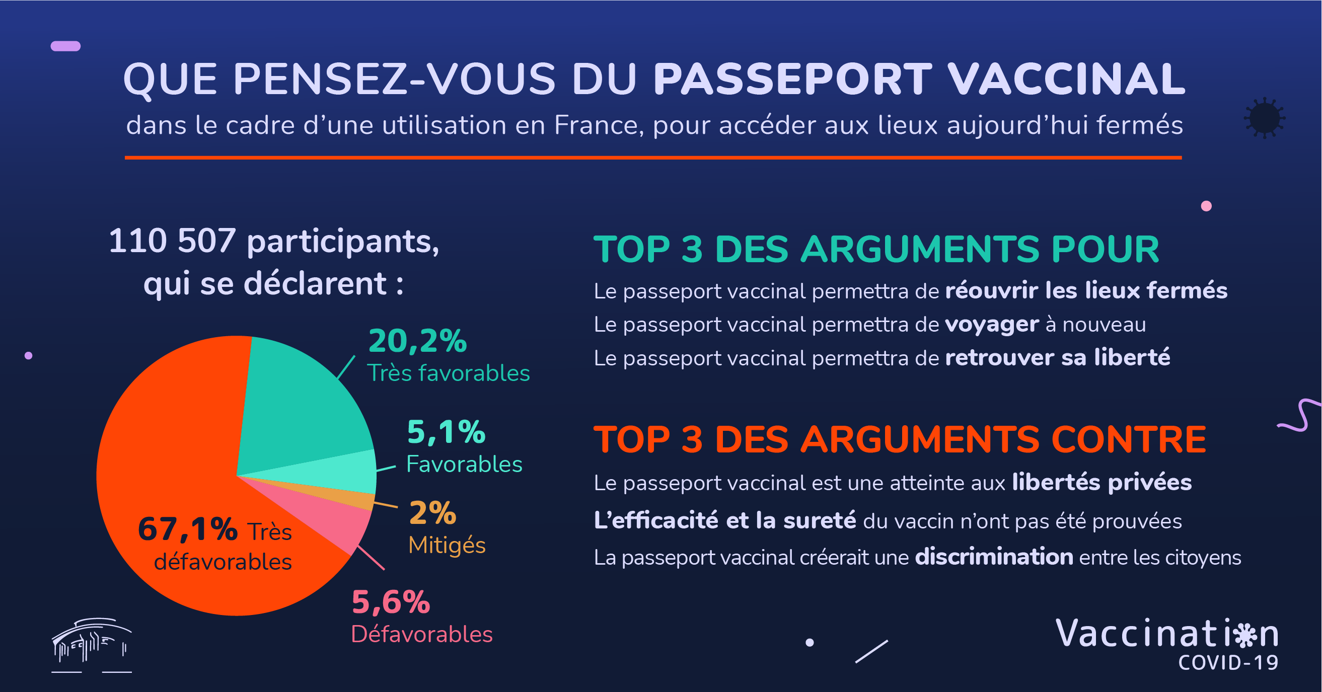 Du 17 février au 7 mars 2021, le CESE (Conseil économique social et environnemental) a organisé, à la demande et au profit du gouvernement une grande consultation en ligne autour de la question : « Que pensez-vous du passeport vaccinal ? »