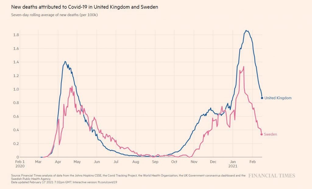 Celui-ci, qui compare les « décès dus au Covid » au Royaume-Uni (confinement) et en Suède (pas de confinement) :