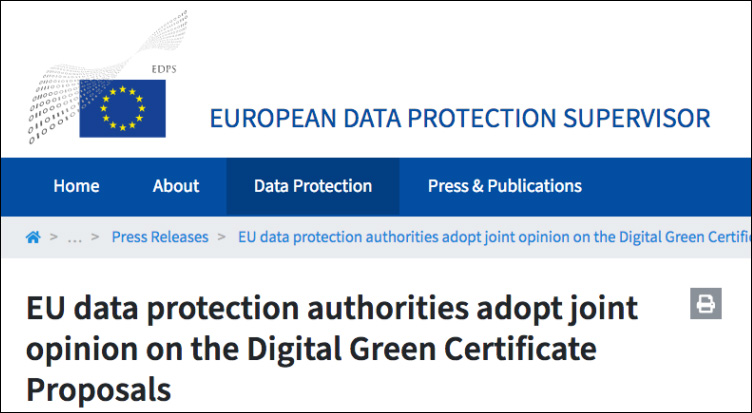 Leur opinion conjointe sur le projet de pass sanitaire européen, publié le 6 avril 2021, est sans équivoque. Les commissaires à la protection des données de tous les pays de l'UE et de l'Espace économique européen soulignent la nécessité d'atténuer les risques pour les droits fondamentaux des citoyens et résidents de l'UE qui pourraient résulter de l'émission du certificat vert numérique, y compris ses possibles utilisations secondaires involontaires. Pour l'autrichienne Andrea Jelinek, présidente de l'EDPB, « toute mesure adoptée au niveau national ou européen qui implique le traitement de données personnelles doit respecter les principes généraux d'efficacité, de nécessité et de proportionnalité. Par conséquent, l'EDPB et l'EDPS recommandent que toute utilisation ultérieure du certificat vert numérique par les États membres ait une base juridique appropriée dans les États membres et que toutes les garanties nécessaires soient en place ».