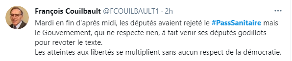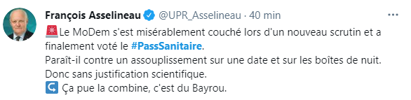 Dans sa version initiale, cet article n'a pas été adopté, grâce à une fronde aussi courte qu'inattendue du Modem, pourtant soutenant la majorité présidentielle. Mais rassurons-nous, ils n'étaient pas opposés sur le principe du pass sanitaire, mais trouvaient les formulations de la ségrégation sanitaire trop floues.