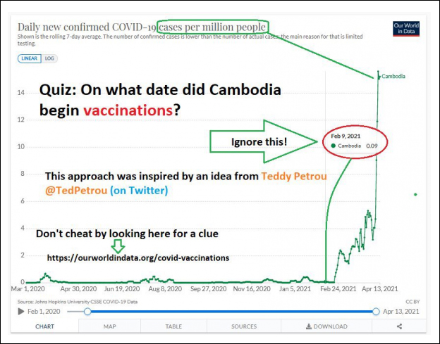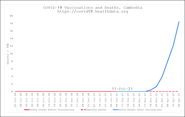 Et si cela n'est pas assez déroutant, regardez ce qui se passe au Cambodge. Le Cambodge a commencé sa campagne de vaccination au début du mois de février après avoir compilé zéro décès. C'est vrai, le pays n'a enregistré aucun décès lié au Covid jusqu'en mars, quelques semaines après avoir lancé son programme de vaccination. Et c'est à ce moment-là que les décès ont commencé à s'accumuler, comme vous pouvez le voir dans le tableau ci-dessous.