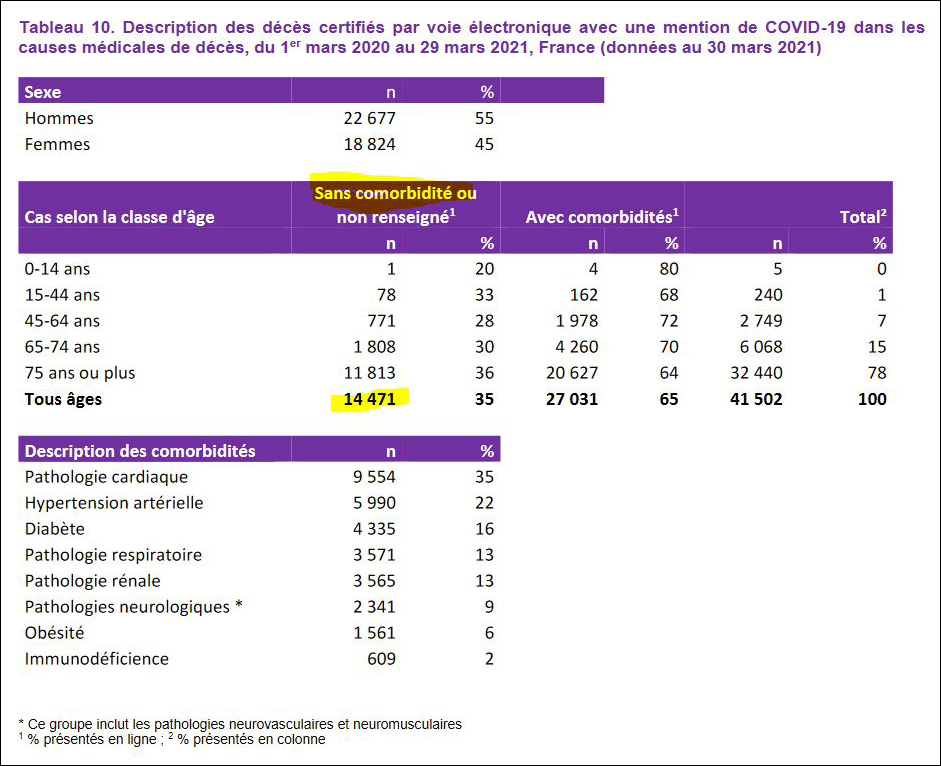 L'actualité donne raison à Pierre Barnérias. Les derniers chiffres de Santé publique France prouvent que ceux diffusés par le gouvernement et ses médias étaient faux et seulement destinés à faire peur. Les traitements étant interdits, ne restent plus que les fameux vaccins expérimentaux, dangereux à court et long terme, mais tellement lucratifs. La preuve : ils ont fait neuf nouveaux milliardaires depuis la campagne de vaccination anti-Covid. Santé publique France annonce 41 502 décès depuis un an, dont 27 000 avec des comorbidités (ce qui veut dire que le malade est mort d'autre chose que du Covid).