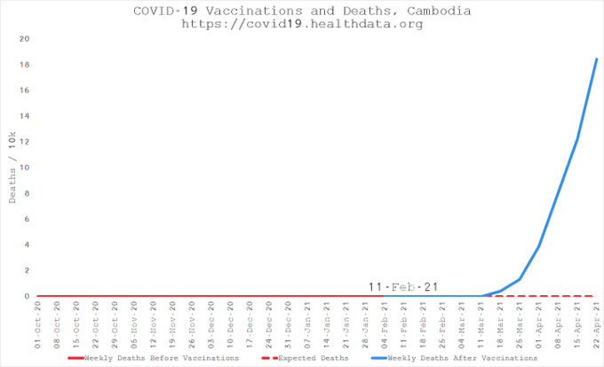 Le Cambodge a commencé sa campagne de vaccination début février après n'avoir compilé aucun décès ; après avoir commencé son programme de vaccination, les décès ont commencé à s'accumuler.