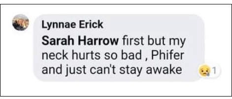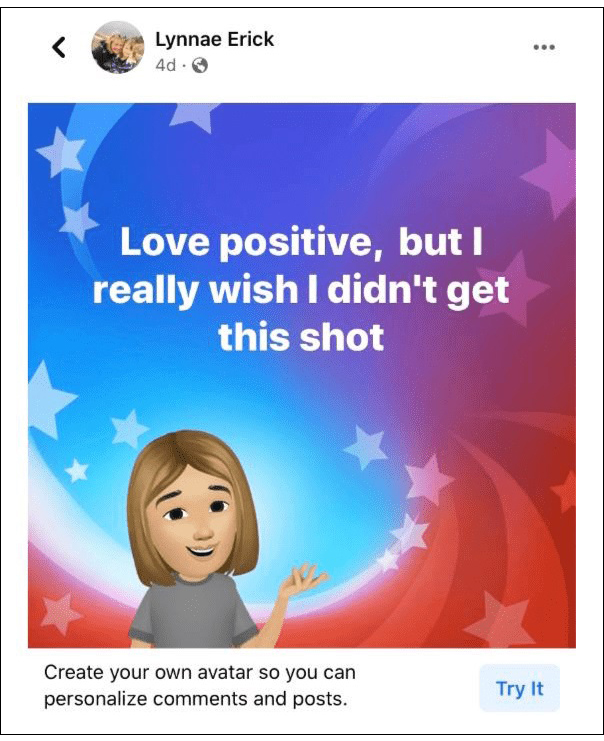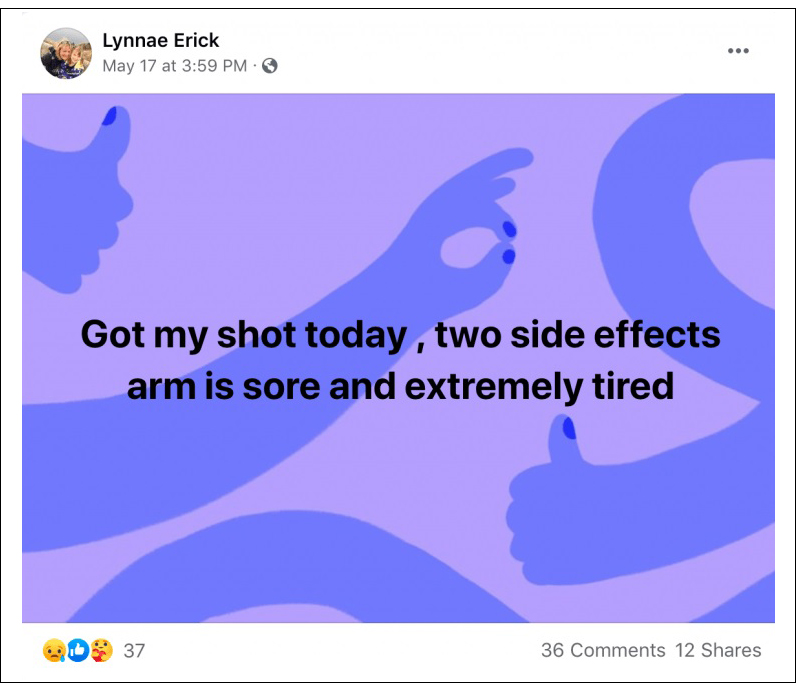 Mme Lynnae Erick a reçu la première dose d'ARNm expérimental de Pfizer le 17 mai 2021, selon sa page Facebook. Elle a d'abord dit que le vaccin était l'AstraZeneca, mais s'est corrigée dans la section des commentaires. Mme Erick a immédiatement signalé une douleur au bras et de la fatigue.