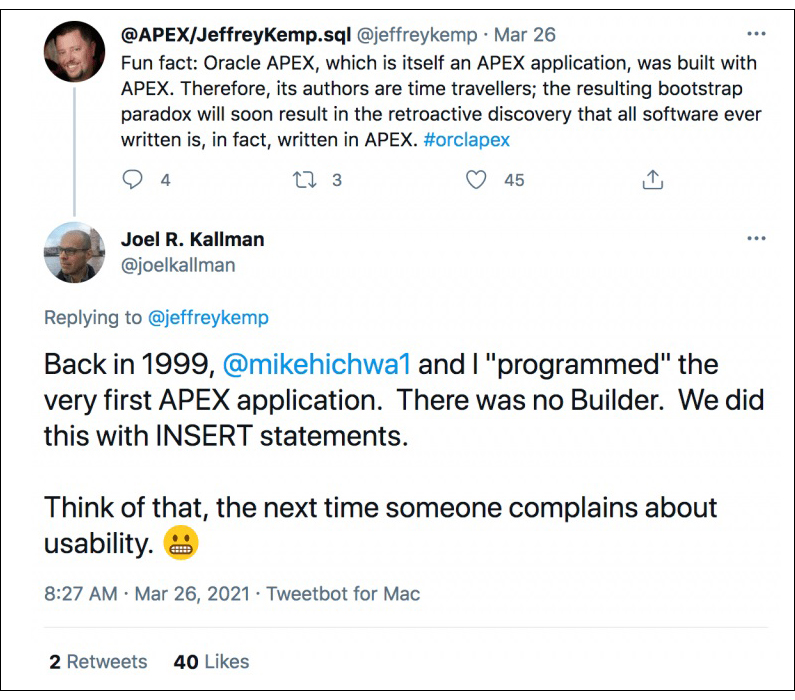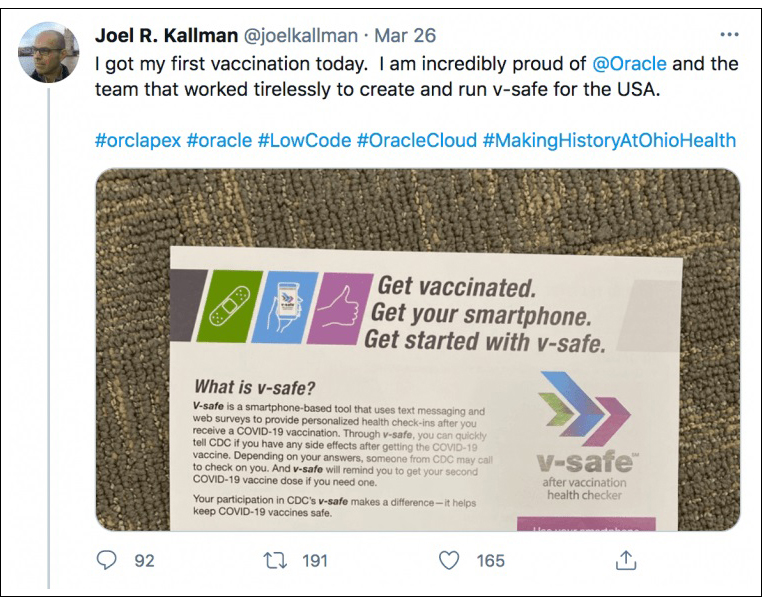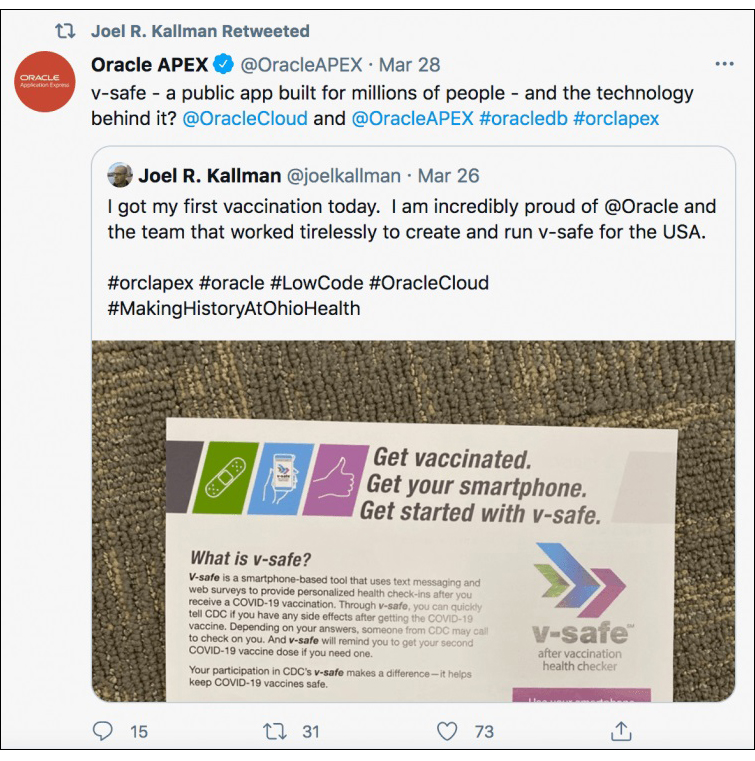 M. Kallman a reçu sa première injection d'ARNm expérimental le 26 mars, selon sa page Twitter. On ne sait pas si c'était Pfizer ou Moderna. Il a félicité son équipe pour avoir créé v-safe dans le tweet. Le compte Twitter d'Oracle APEX a retweeté M. Kallman deux jours plus tard, se réjouissant davantage de la façon dont ils ont créé la plate-forme v-safe.