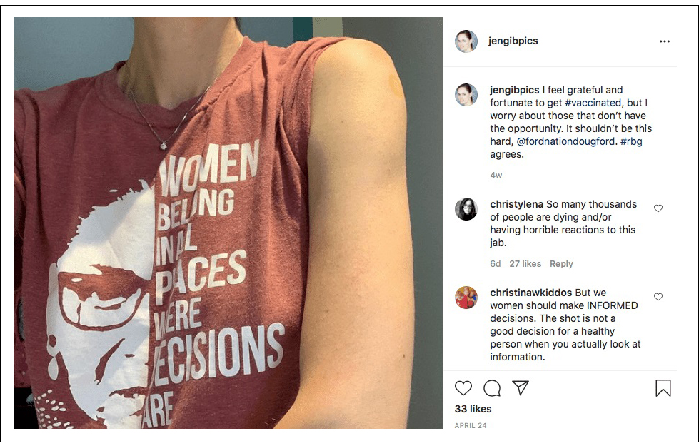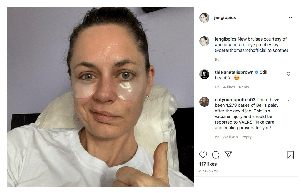 Mme Jennifer Gibson a reçu le vecteur viral expérimental AstraZeneca le 24 avril, selon sa page Instagram. Elle a exprimé sa gratitude et sa sympathie apparente pour ceux qui « n'ont pas la possibilité » de recevoir des injections expérimentales.