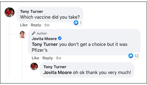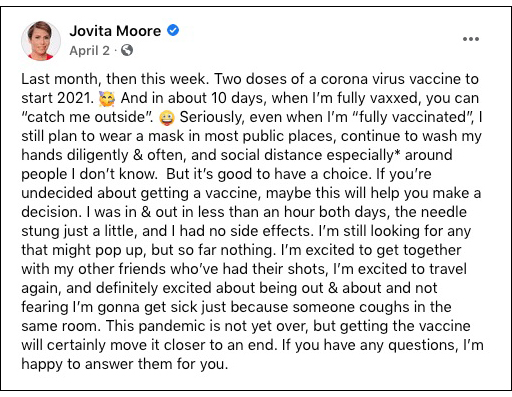 Mme Moore a reçu la deuxième dose d'ARNm expérimental de Pfizer le 2 avril, selon sa page Facebook. Sa publication sur Facebook ce jour-là est pleine d'ironie triste et dramatique.