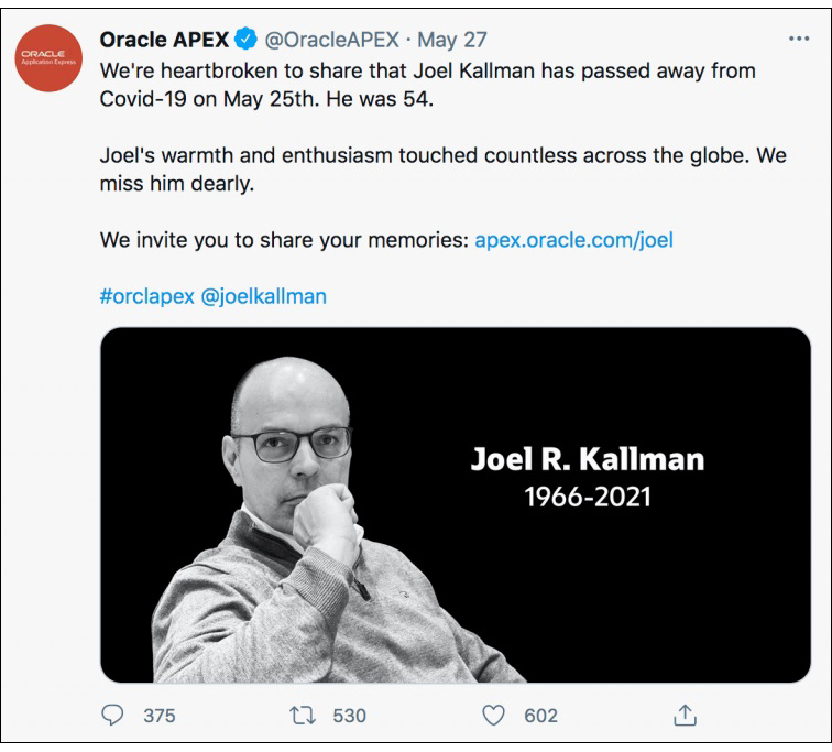 Oracle APEX a tweeté le 27 mai que M. Kallman « est décédé du COVID-19 ».
