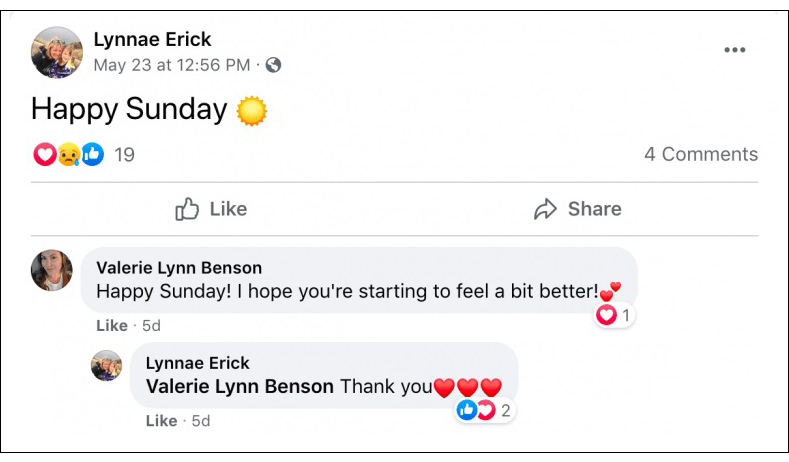 Son état s'est progressivement aggravé au cours de la semaine suivante. Alors qu'elle publiait de nombreux messages positifs (comme c'était évidemment sa nature), Mme Erick souffrait. Elle a dit que son cou était douloureux et qu'elle ne pouvait pas du tout rester éveillée. Mme Erick a publié une mise à jour très triste le samedi 22 mai.