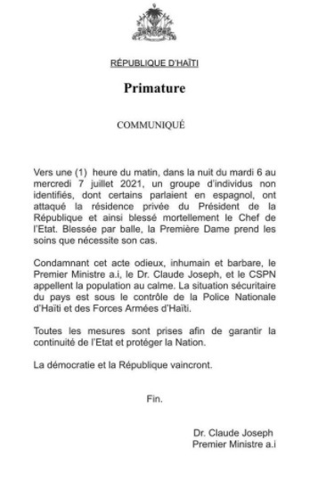 «Vers une heure du matin, dans la nuit du mardi 6 au mercredi 7 juillet 2021, un groupe d'individus non identifiés, dont certains parlaient en espagnol ont attaqué la résidence privée du Président de la République et ainsi blessé mortellement le chef de l'Etat», a fait valoir Claude Joseph dans un communiqué.