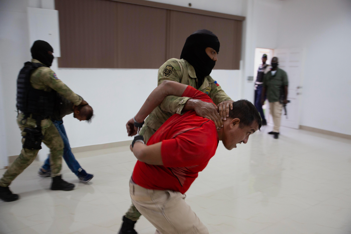 Grosso is pictured in the rear (blue jeans) being moved following a press in Port-au-Prince, July 8, 2021. Joseph Odelyn | AP
