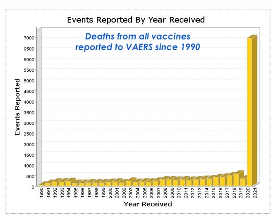 Entre le 14 décembre 2020 et le 25 juin 2021, un total de 411 931 événements indésirables au total a été signalé au VAERS, dont 6985 décès, soit une augmentation de 872 décès par rapport à la semaine précédente.