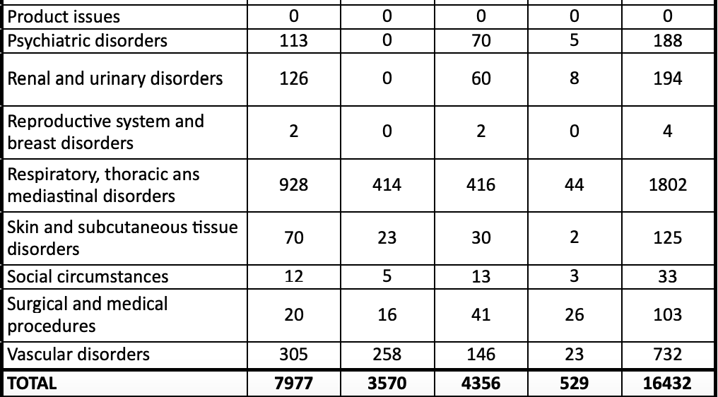 Un tableau à la même date donne une idée du type d'effets indésirables constatés et signalés et donc possibles pour les nouveaux vaccinés (la deuxième dose paraissant toujours plus à risque que la première). Vous remarquerez la fréquence des complications vasculaires et cardiologiques dues à la toxicité maintenant reconnue de la protéine Spike fabriquée par les organismes vaccinés.
