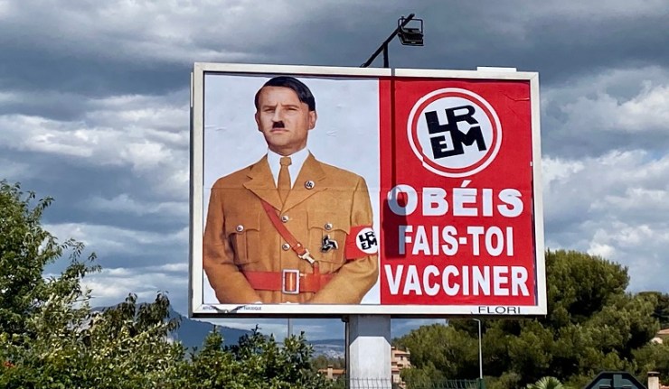 À Toulon, une affiche géante fait apparaître Emmanuel Macron en Hitler, avec le slogan : « Obéis, fais-toi vacciner ». Quelques heures après l'installation de cette affiche, elle a été taguée du mot « honte ».