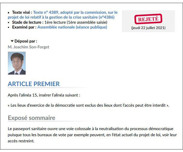 Amendement n°850Déposé le mercredi 21 juillet 2021 Franck Noir™🩲🍆 22/07/2021Les Français non-vaccinés viennent de perdre le droit de vote. #AssembleeNationale source : profession-gendarme.com reseauinternational.net