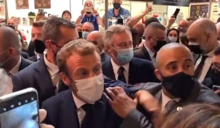 Le 27 septembre, toujours aussi populaire, le petit Roi reçoit un œuf sur l'épaule alors qu'il se promenait sur ses terres à Lyon, au Salon international de la restauration et du tourisme. Si, si, en période de SOS Covid (au secours, on va tous mourir !!!), quand justement ces secteurs ont été parmi les plus touchés, quand il faut être codé pour aller au resto ou faire du tourisme, justement, Macron va rendre visite au patient, voir s'il respire encore.