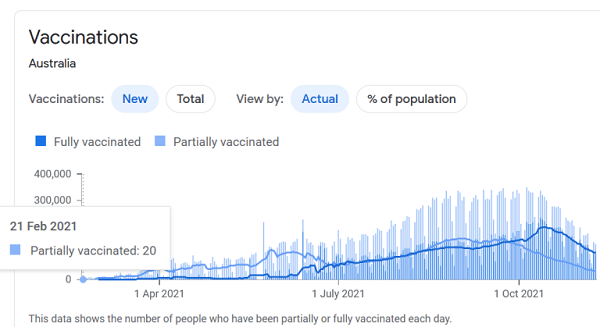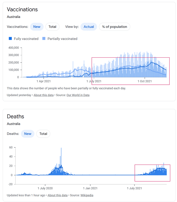 Mais ce qu'il est également intéressant de noter à partir des données officielles, c'est que le redémarrage soudain des décès de Covid-19 en Australie semble être en corrélation avec le nombre de deuxièmes doses de vaccin Covid-19 administrées.