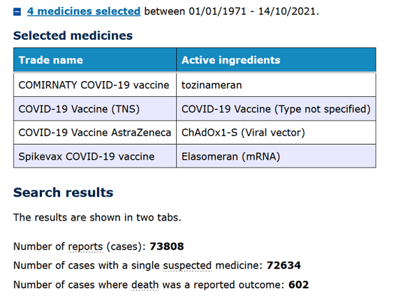 Une recherche dans la base de données des notifications d'événements indésirables hébergée par l'Administration des produits thérapeutiques (TGA) du ministère australien de la Santé pour les effets indésirables dus aux vaccins Covid-19 montre que jusqu'au 14 octobre 2021, un total de 72 808 rapports d'événements indésirables avaient été fait à la TGA. Cela comprend 602 décès.