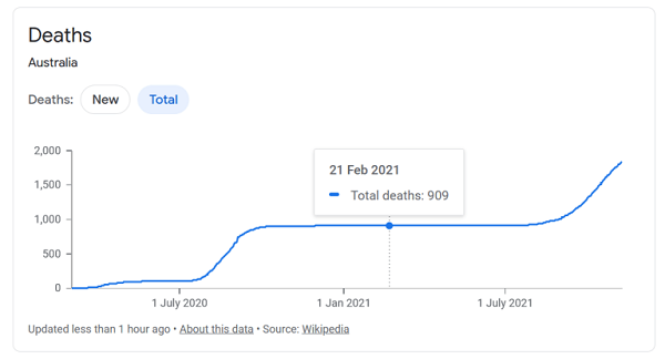 À ce stade, l'Australie avait enregistré 909 décès présumés de Covid-19, un nombre qui n'avait pas augmenté depuis le 29 décembre 2020, et n'a augmenté à nouveau que le 13 avril 2021.
