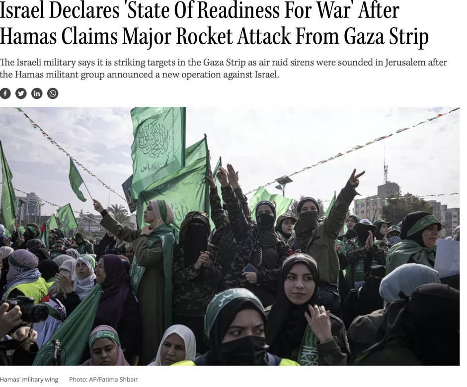 Tôt le samedi 7 octobre 2023, le Hamas a lancé l'opération « Tempête Al-Aqsa », dirigée par le chef militaire du Hamas, Mohammed Deif. Le même jour, Netanyahou a confirmé un soi-disant « état de préparation à la guerre ».