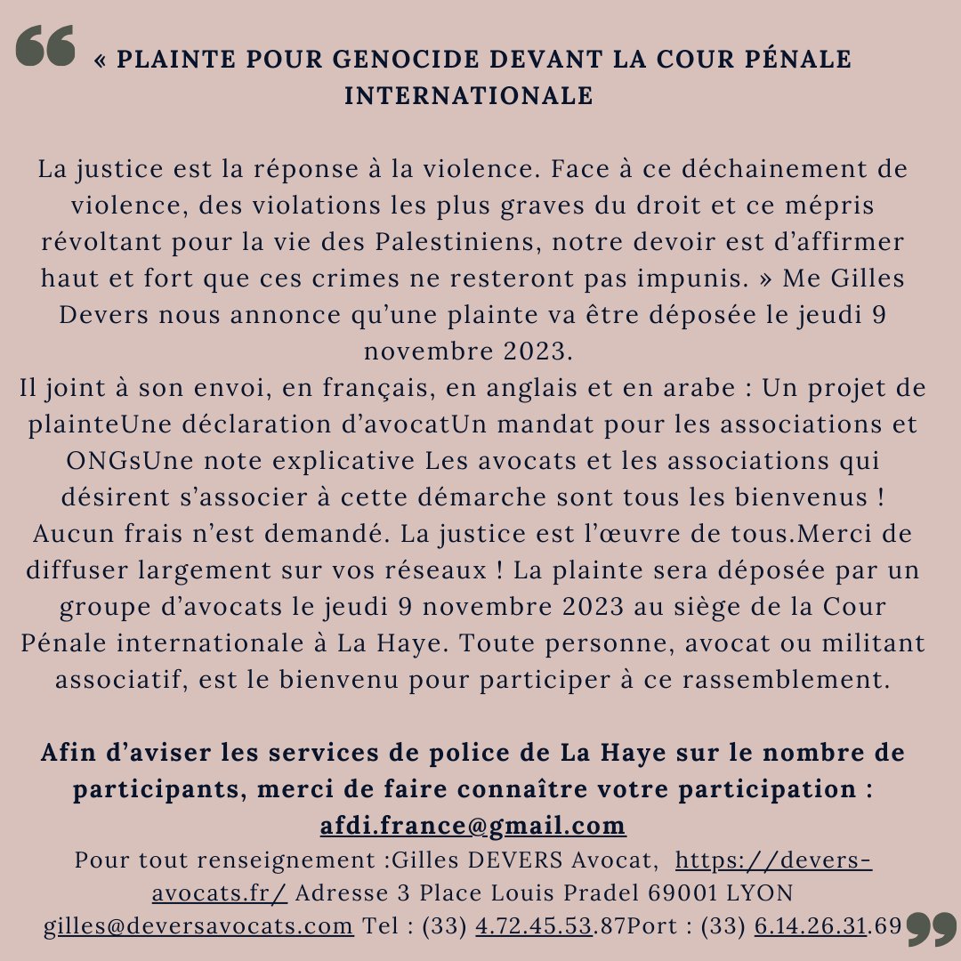 La plainte sera déposée le 9 novembre 2023. Si vous souhaitez être partie prenante de la plainte (aucun frais n'est demandé) et/ou si vous souhaitez être présent-e au rassemblement à La Haye pour le dépôt de plainte du 9.11, lire les instructions sur l'annonce.