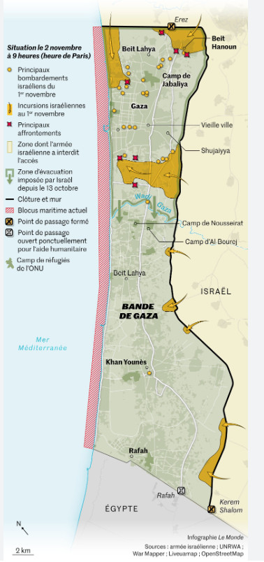 Le Premier ministre Benjamin Netanyahou a réaffirmé qu'aucune livraison de carburant ne serait autorisée à entrer dans la bande de Gaza avec la mince file de camions d'aide qui traversent le point d'entrée de Rafah à partir de l'Égypte. Au moins 16 des 35 hôpitaux de Gaza ont cessé de fonctionner en raison du manque de carburant, les autres fonctionnant avec de faibles réserves. Al-Shifa et l'hôpital indonésien seraient menacés d'effondrement imminent, leurs générateurs étant à court de carburant.