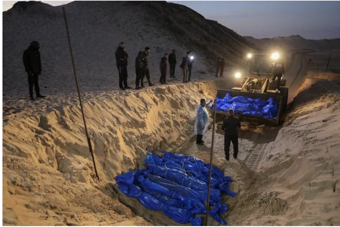 Des citoyens enterrent les corps de Palestiniens tués dans une fosse commune, mardi à Rafah, à Gaza. / Photo by Ahmad Hasaballah/Getty Images.