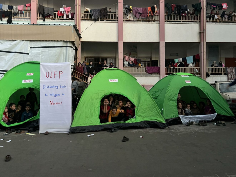Le plus catastrophique est le manque d'abris effectifs pour la plupart des personnes déplacées dans ces écoles. Elles ont investi les terrains, les jardins et les routes adjacentes dans l'espoir d'une certaine sécurité. Le besoin fondamental reste la fourniture immédiate de tentes aux familles déplacées ainsi que la fourniture de toute une liste d'aliments et d'articles sanitaires. Grâce à une réponse rapide et avec les fonds disponibles, l'équipe en lien avec l'UJFP a immédiatement fourni et distribué trente tentes à des personnes déplacées dans les abris du camp de Nuseirat. L'équipe a en core besoin de fonds pour répondre à d'autres besoins fondamentaux. Des membres de l'équipe sur le terrain ont été attaqués à cause du nombre insuffisant de tentes par rapport aux nécessités. »