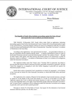 3. L'Afrique du Sud est parfaitement consciente du poids particulier de la responsabilité lorsqu'elle engage des poursuites contre Israël pour violations de la convention sur le génocide. Cependant, l'Afrique du Sud est également parfaitement consciente de sa propre obligation – en tant qu'État partie à la Convention sur le génocide – de prévenir le génocide. Les actes et omissions d'Israël à l'égard des Palestiniens violent la Convention sur le génocide. C'est le point de vue partagé par de nombreux autres États parties à la Convention, y compris l'État de Palestine lui-même, qui a appelé les « dirigeants du monde » à « prendre leurs responsabilités... pour mettre fin au génocide contre notre peuple ».4 Les experts des Nations Unies ont également déclaré à plusieurs reprises a tiré la sonnette d'alarme pendant plus de 10 semaines sur le fait que « compte tenu des déclarations faites par les dirigeants politiques israéliens et leurs alliés, accompagnées d'une action militaire à Gaza et d'une escalade des arrestations et des meurtres en Cisjordanie », il existe un « risque de génocide contre le peuple palestinien »5. mettre immédiatement fin au risque de génocide contre le peuple palestinien. »6 Le Comité pour l'élimination de la discrimination raciale (« CERD »), agissant dans le cadre de sa « procédure d'alerte rapide et d'action urgente », a également appelé « tous les États parties » à la Convention sur le génocide de « respecter pleinement » leur « obligation de prévenir... le génocide ».7 Cette demande de l'Afrique du Sud et sa demande en indication de mesures conservatoires doivent être examinées dans ce contexte et à la lumière de ces appels. Elle s'inscrit dans le contexte de l'objectif de politique étrangère de l'Afrique du Sud visant à parvenir à une paix durable entre Israël et l'État de Palestine, avec deux États existant côte à côte à l'intérieur de frontières internationalement reconnues, fondées sur celles existant le 4 juin 1967, avant le déclenchement de la guerre israélo-arabe de 1967, conformément à toutes les résolutions pertinentes des Nations Unies et au droit international.