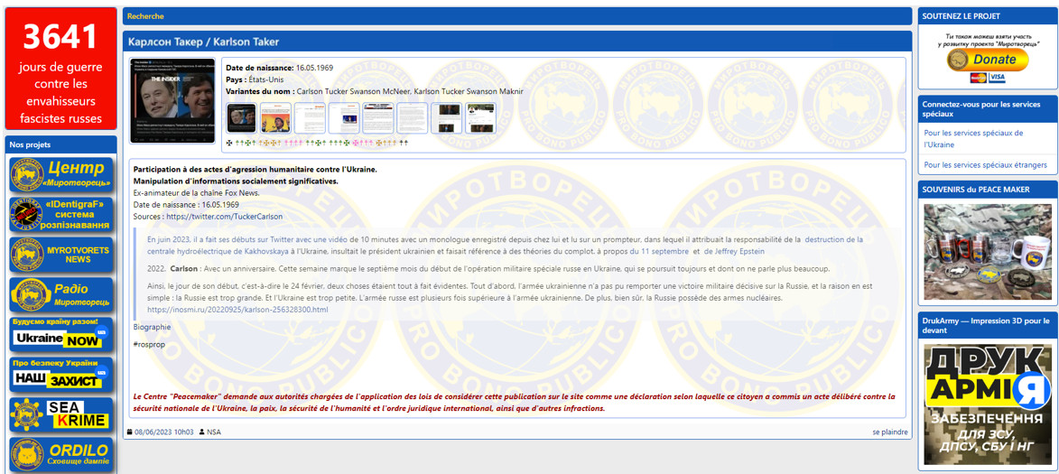 Après avoir fait son interview avec le président Poutine, Tucker Carlson qui a son nom inscrit sur le site ukrainien myrotvorets.center devient plus encore une cible potentielle identifiée comme ennemi de l'Ukraine.