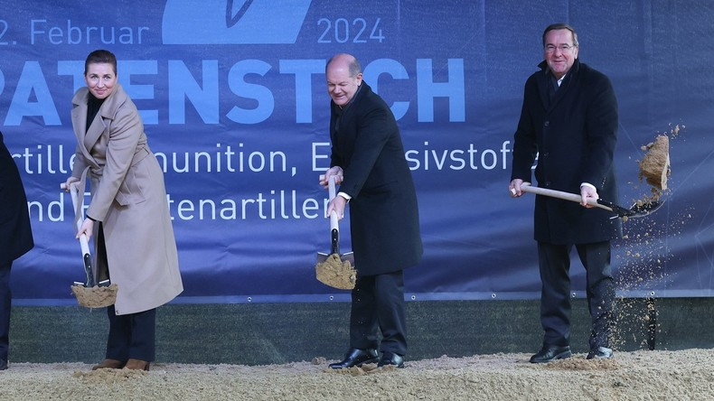 Olaf Scholz a donné le symbolique premier coup de pelle d'une nouvelle usine du fabricant d'armes Rheinmetall sur le plus important complexe industriel de défense du pays, à Untelüss, dans le nord de l'Allemagne. La nouvelle unité doit produire à partir de 2025 des munitions d'artillerie de 155 millimètres, en visant progressivement une capacité de 200 000 obus par an.
