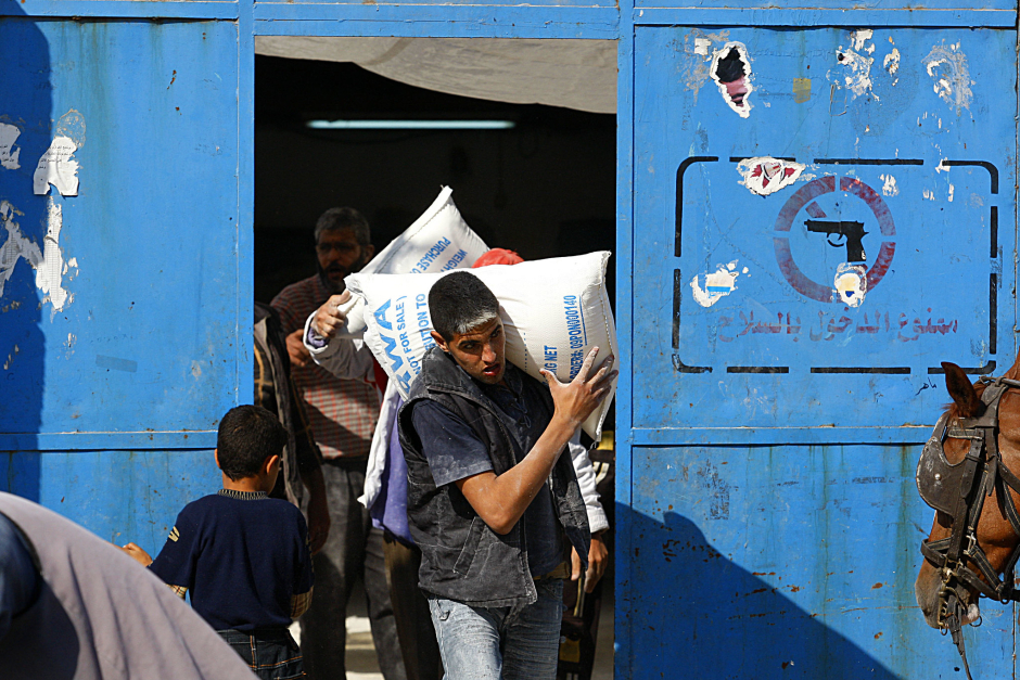 Décembre 2009 : Un ouvrier transporte un sac de farine dans un centre de distribution alimentaire de l'ONU dans le camp de réfugiés de Shati. (Suhair Karam, IRIN, Flickr, CC BY-NC-ND 2.0).