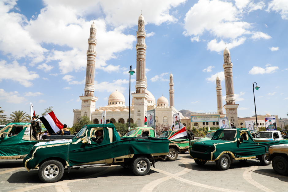 In the courtyard of Yemen's famous Al Shaeb Mosque, guards of honor stood at attention accompanied by the melody of military music as the funeral ceremony of Yemeni marines killed in the latest round of U.S. and UK strikes commenced. The mourners, many of whom traveled from the countryside to attend, walked alongside a long convoy carrying the bodies of 17 victims as it made its way through the streets of Sana'a. Mourners held aloft photos of the deceased or thrust their rifles into the air while chanting slogans condemning the United States. Several banners peppered the crowd, emblazoned with the label given to those who gave their lives in what many view as a struggle in defense of Palestine: "Martyrs on the road to al-Quds (Jerusalem)."