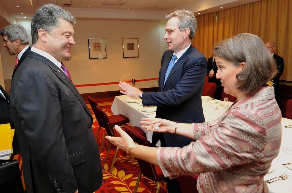 Juin 2014 : Le président ukrainien Petro Porochenko, M. Pyatt et Mme Nuland se rencontrent à Varsovie. Le secrétaire d'État de l'époque, John Kerry, est à l'arrière-plan à droite. (Département d'État)