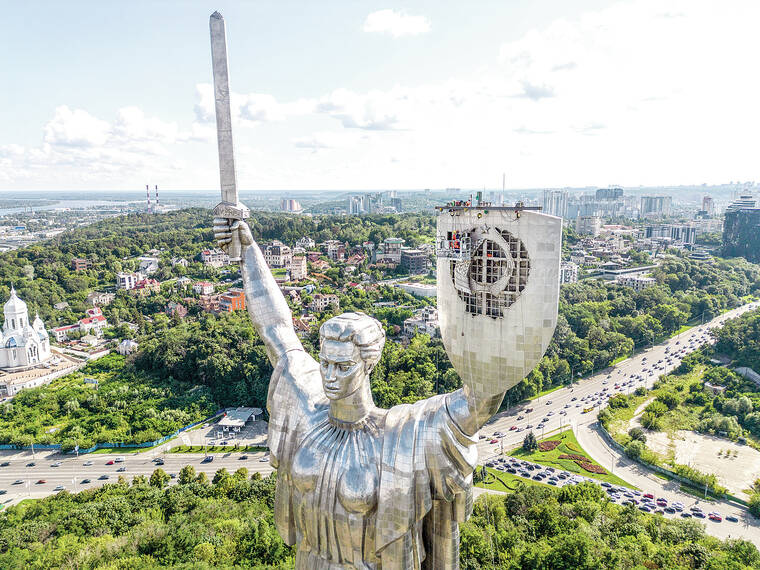 The Motherland Monument is seen after workers removed a Soviet emblem from the shield of the monument in Kyiv, Ukraine, Tuesday, Aug. 1, 2023. (AP Photo/Jae C. Hong)