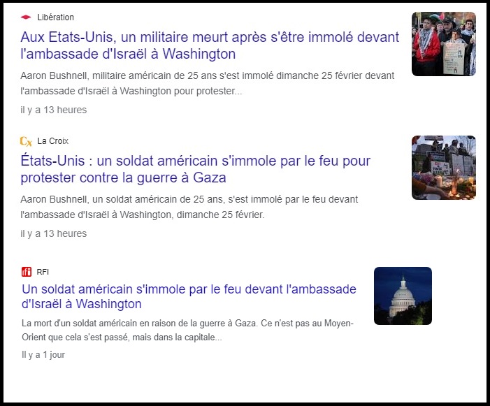 Pour preuve, à l'heure d'écrire ces lignes, soit 3 jours après la diffusion internationale du sacrifice d'Aaron Bushnell, cette info a été relayée et (mal)traitée par... 4 médias européens d'expression française (RFI, Libération, La Croix et la RTBF).
