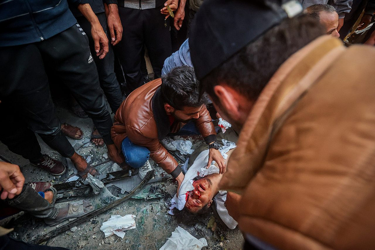 Des Palestiniens sur le site d'une frappe aérienne israélienne à Rafah, dans le sud de la bande de Gaza, le 24 février 2024. (Atia Mohammed/Flash90)