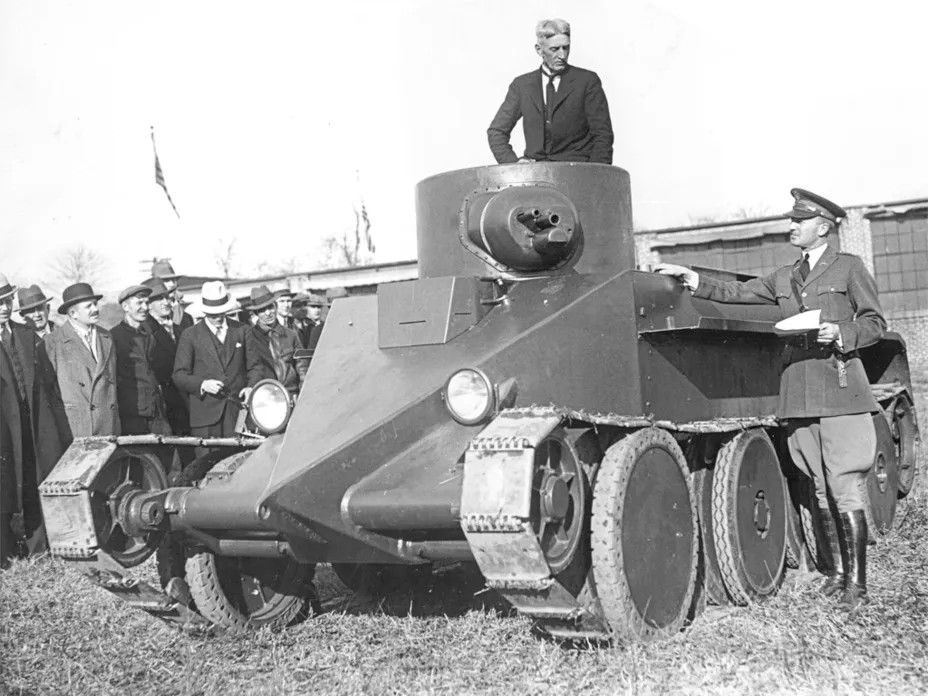 Christie est debout sur son prototype de char de 1931. Notez les roues du char. Notez également le blindage incliné, une invention de Christie. L'armée américaine a rejeté la conception du char de Christie, mais l'Union soviétique a sauté sur l'occasion pour les obtenir, envoyés en Russie en tant qu'équipement agricole (sans canons). La conception de Christie a servi de base au char BT soviétique et au célèbre T-34.