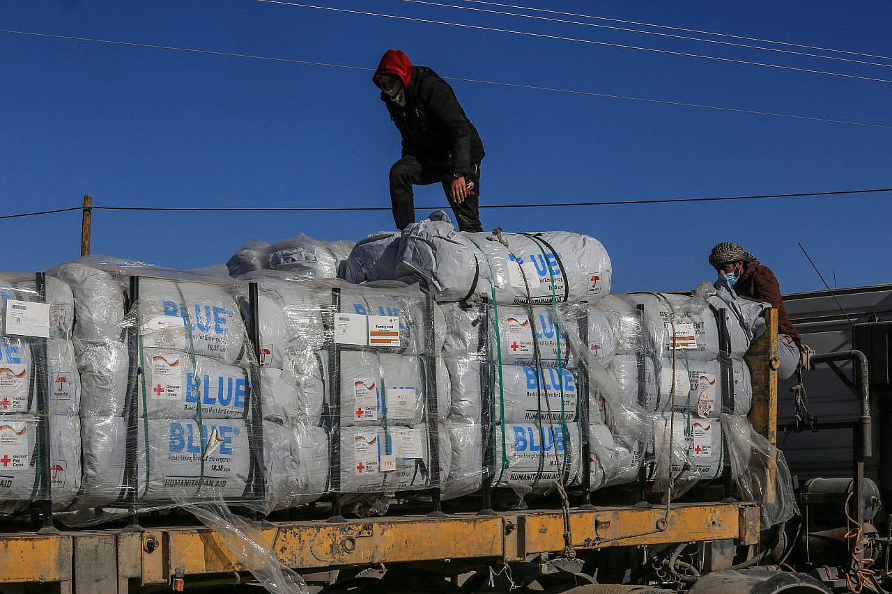 Des camions d'aide arrivent du côté palestinien du poste frontière de Kerem Shalom, dans le sud de la bande de Gaza, le 17 février 2024. (Abed Rahim Khatib)